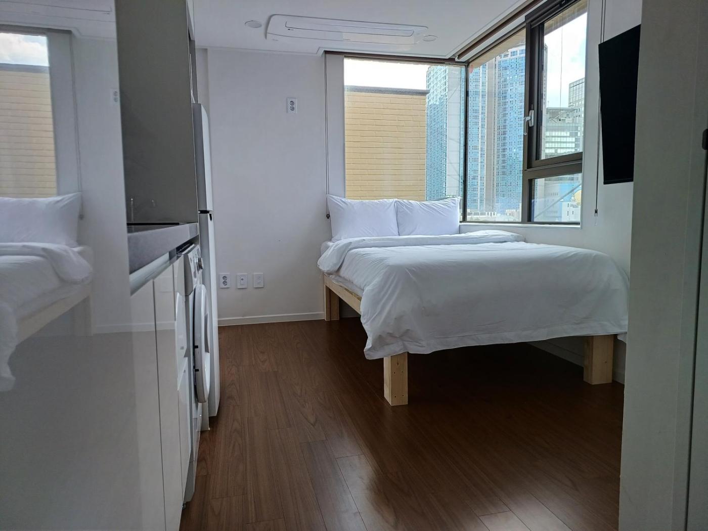 Superior Double Room. The double room provides a dining area, a wardrobe, as well as a private bathroom boasting a shower and a hairdryer. In the kitchenette, guests will find a refrigerator, kitchenware, a microwave and an electric kettle. The double room offers a flat-screen TV with streaming services, a washing machine, soundproof walls, a seating area as well as city views. The unit has 1 bed. ;