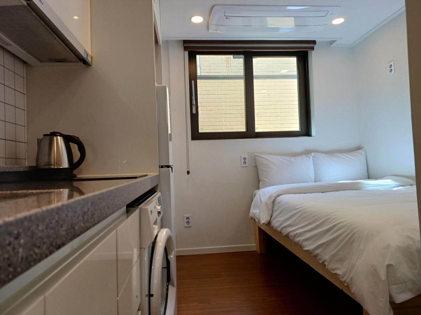 Deluxe Double Room with Shower. The double room provides a dining area, a wardrobe, as well as a private bathroom boasting a shower and a hairdryer. Guests can make meals in the kitchenette that features a refrigerator, kitchenware, a microwave and an electric kettle. The double room features a flat-screen TV with streaming services, a washing machine, soundproof walls, a seating area as well as ancourtyard view. The unit has 1 bed. ;